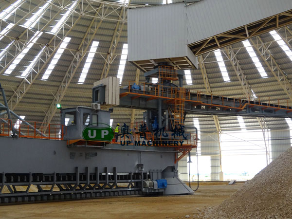 懸臂堆料系統(tǒng)、橋式刮板取料系統(tǒng)、料耙系統(tǒng)、中心柱機(jī)構(gòu)、回轉(zhuǎn)部分、潤(rùn)滑系統(tǒng)、軌道系統(tǒng)、控制室等部件組成。