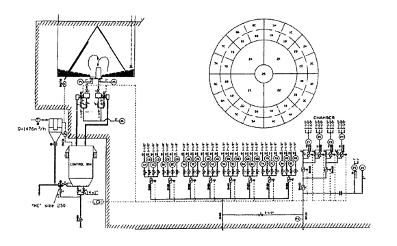 CP生料均化庫是我公司引進(jìn)的德國BMH公司的一種新型生料均化庫,其特點電耗低、均化效果好。CP生料均化庫的均化原理是庫頂生料通過8條斜槽均勻布料,不同時期的生料在庫內(nèi)呈橫向分布,庫底充氣系統(tǒng)設(shè)計更符合生料充氣后的流動性,呈放射狀斜向分布,環(huán)形區(qū)一般分8個區(qū),每隔5分鐘輪流充氣,充氣區(qū)生料因松動及氣流的引導(dǎo)卸入中心區(qū),庫內(nèi)不同層的生料豎向切割下料實現(xiàn)生料的均化,不同時間的生料進(jìn)入中心區(qū)后再進(jìn)行氣體強(qiáng)烈混合均化,從而達(dá)到理想的均化效果。