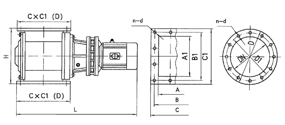| A1×A | B1×B | C1×C | DN | D | D1 | H | L | n-d | 傳動(dòng)功率型號(hào) | 功率KW | 卸灰能力 m3/h | 重量kg |