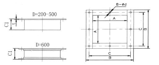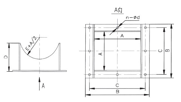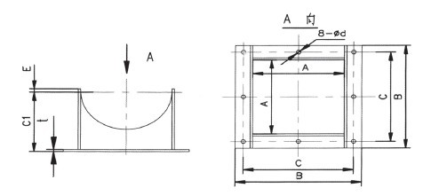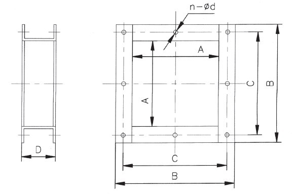 出料口的結(jié)構(gòu)表示如下圖,其系由鋼板折成的方形管及法蘭焊接而成,它不帶能關(guān)閉的出料口控制機構(gòu),在使用時將出料口焊于機殼上,其法蘭面與溜槽法蘭相聯(lián),裝配出料口的機殼還應按出料口的內(nèi)孔尺寸開孔。