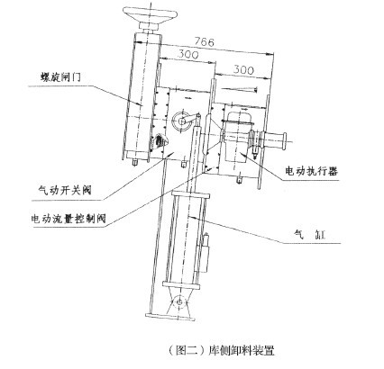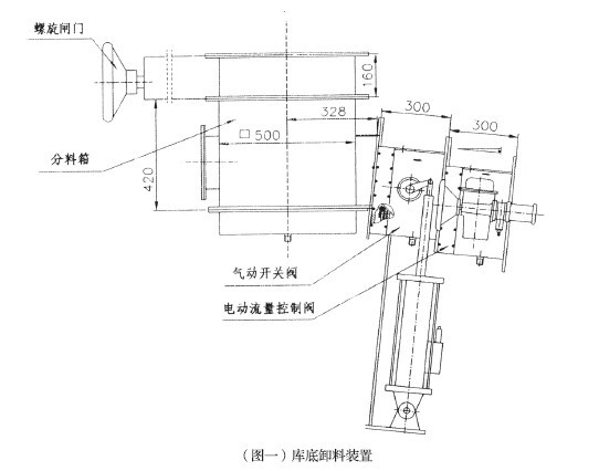 庫底卸料裝置由庫底螺旋閥、庫底分料箱、氣動開關(guān)閥、電動流量控制閥及卸料溜子組成(見圖一),用于水泥生料粉或水泥庫底卸料。庫底卸料裝置能自動調(diào)節(jié)卸料流量且均勻,其結(jié)構(gòu)合理,操作維護(hù)簡單方便,可設(shè)三個下料口,用戶也可選用庫側(cè)卸料裝置(見圖二)。
